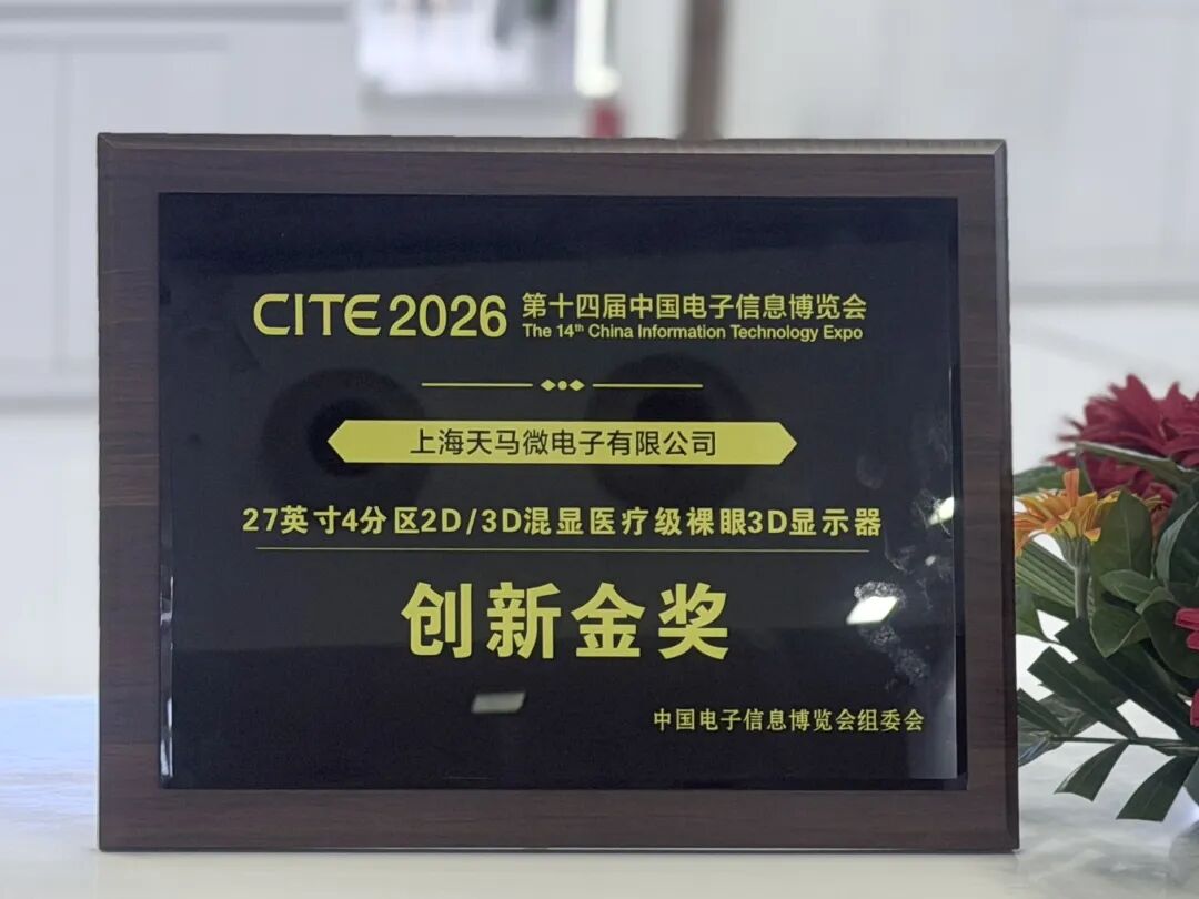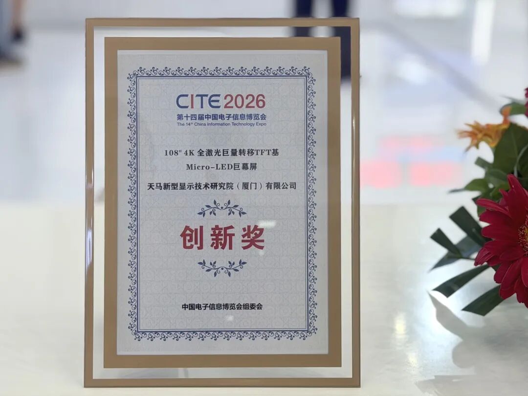 同期举办的CITE 2026创新奖评选中,天马微电子凭借突出的技术创新能力与产品竞争力,在众多参评企业中脱颖而出,凭借硬核技术实力一举斩获1项创新金奖、2项创新奖。其中,27英寸2D/3D混显医疗级裸眼3D显示器凭借技术突破性与场景实用性,荣获“创新金奖”;108英寸4K全激光巨量转移TFT基Micro-LED巨幕屏、6.32英寸FSD+240Hz AMOLED显示屏凭借独特的技术优势与创新价值,荣获“创新奖”。