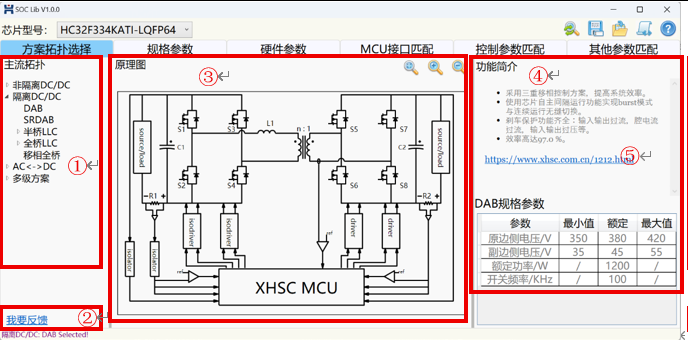 用户如果需求双向隔离型DC/DC应用,则可以选择隔离DCDC下的DAB拓扑,单击“DAB”后,右侧“原理图③”和“功能简介④”显示选择的“DAB”参考设计原理图,规格参数和功能简介,如果想要详细资料可以点击官网链接⑤。