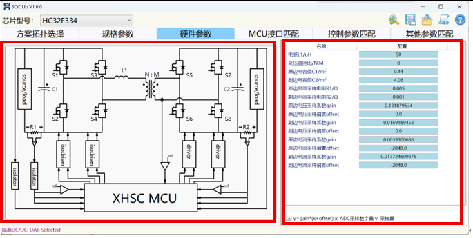 完成规格参数输入后,单击规格“硬件参数”选项卡,进入硬件参数输入界面,该界面输入程序中需要用到的硬件参数,默认参数为参考设计采用的硬件参数,如图1‑3为DAB拓扑硬件参数界面,界面左侧为原理框图,并标出参考设计关键硬件元器件标号,用户需将实际使用的参数填入右侧的对应参数框中,包括磁性元器件参数和采样校准系数。