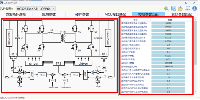 选取“控制参数匹配”界面选项卡,界面左侧为系统控制框图,右侧可设置控制参数,默认参数为参考设计控制参数,包括控制环路参数,保护参数以及控制阈值等。如图1‑5所示为DAB拓扑控制参数设置,用户可根据SPEC和实际需求对应修改,参数修改后会在程序中作对应修改。