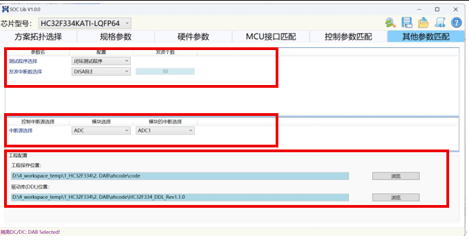 其它参数匹配:选择目标功能程序,控制中断源以及相关程序路径选择,默认显示参考设计配置参数;