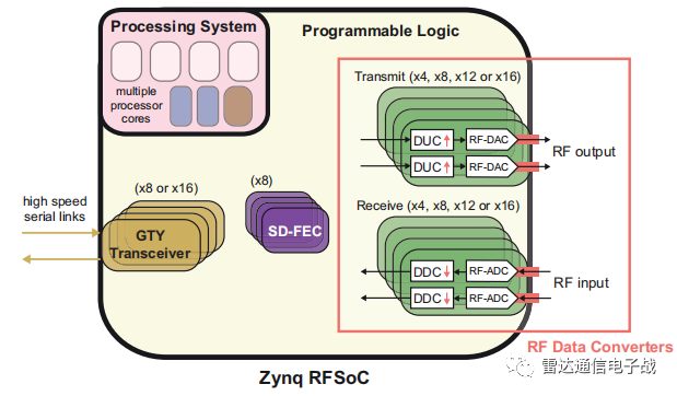 所有三种SoC类型都由用于运行软件的处理系统(PS)、现场可编程门阵列(FPGA)的可编程逻辑(PL)以及两部分之间的高速互连等部分组成。RFSoC器件架构的如图所示。请注意PS和PL部分,特别是PL包含一些对SDR应用特别重要的突出显示功能。