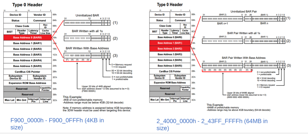 例如,若回读值的低 12 位为全0,表示该 BAR 请求的空间大小为4 KB。随后,主机将在高位分配一个基地址(如 0xF9000),并将其与 BAR 中确定的大小范围组合,最终形成完整的设备地址空间,例如:0xF9000000 ~ 0xF9000FFF。