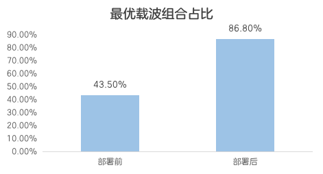 辅载波优选部署后,多频层组网区域拉网,终端使用最优载波组合的占比从43.5%提升到86.8%;下行速率有明显提升。