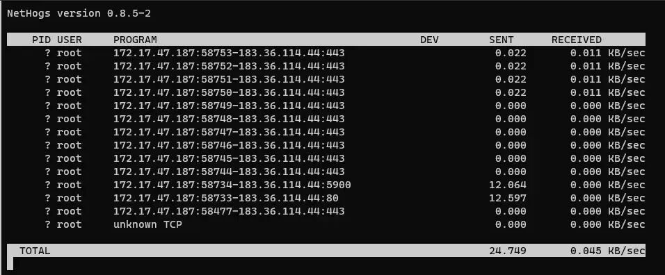 NetHogs 是一个在终端中运行的简单开源实用程序。它不是按协议或每个子网分解流量,而是按进程对 bandwith 进行分组。这对于查找挂起程序的 PID 或仅查看正在消耗带宽的内容非常有帮助。它主要依赖于/proc,因此大多数功能仅适用于Linux。
