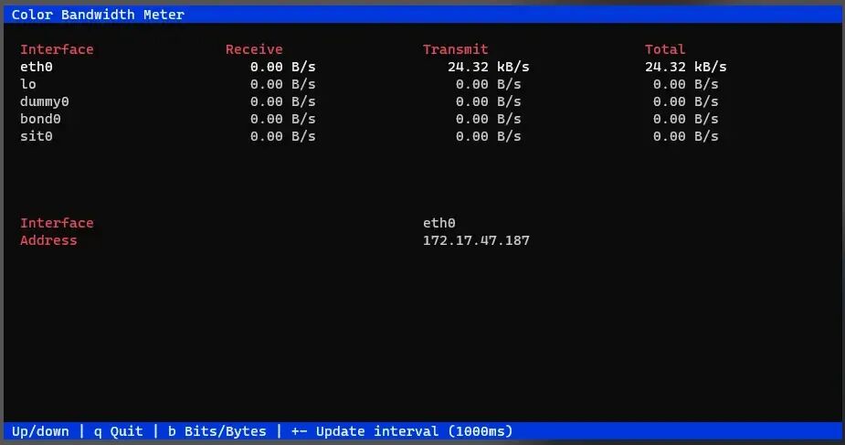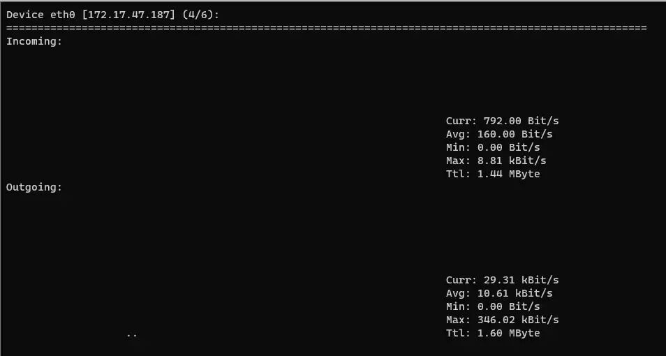 nload 是一个开源控制台应用程序,可让您实时监控网络流量和带宽使用情况。它使用图表可视化传入和传出流量,同时还提供附加信息 (传输数据总量、最小/最大网络使用量等)。这是一个简单易用的工具,有时会非常有用。