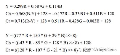 这是官方给的RGB888 to YCbCr的算法公式,我们可以直接把算法移植到FPGA上,但是我们都知道FPGA无法进行浮点运算,所以我们采取将整个式子右端先都扩大256倍,然后再右移8位,这样就得到了FPGA擅长的乘法运算和加法运算了。