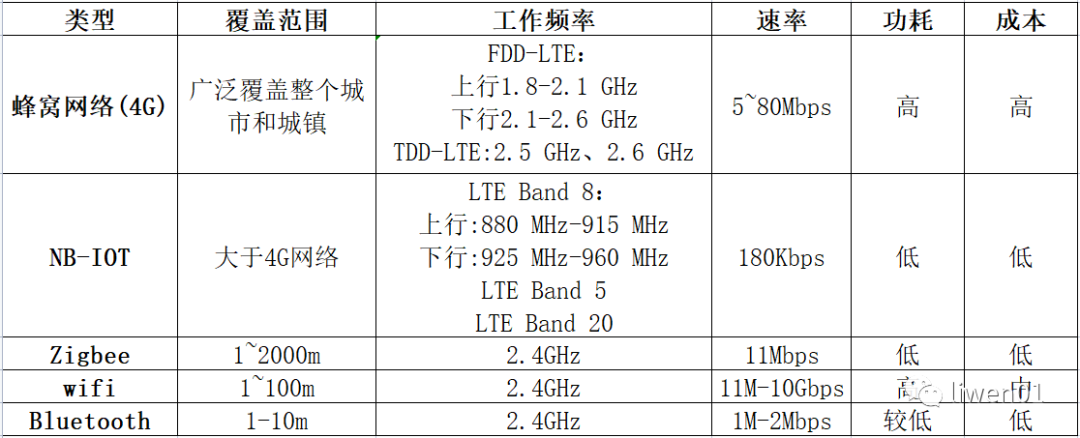 根据上面介绍的几种无线通信技术和标准,我们做个简单的对比。