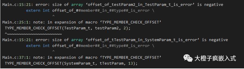 编译时则报错:(通过offset_of_testParam2_in_TestParam_t_is_error就能定位是哪个结构体的哪个成员变量偏移位置不对了):