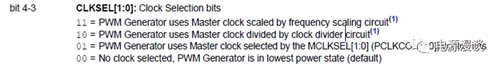 在reference manual中也对PWM高精度模式做了一些说明,如下截图中的注释Note中,我们可以看到使用PWM高精度模式时,必须要将CLKSEL设置为0b01,也就是必须要直接选择我们给PWM模块选择的总的master时钟源,而不能采用频率分频电路或者频率调整电路之后的时钟源。这是文档中对高精度PWM模式时钟源的“定性限制“。