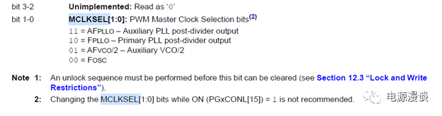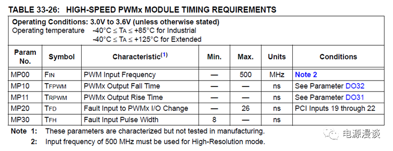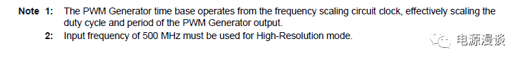 这里我们重点关注PMW模块的输入频率,Microchip建议必须要在500M下实现高精度模式PWM,那么潜在意思是如果采用低于500M的输入频率时,这个高精度PWM模式就不做保证了,最多就是在±10%范围内变化(即最小450MHz),产品出厂前所有相关的PWM高精度电路的验证测试都是基于这个条件去进行。这是关于PWM高精度模式运行频率的一个“定量限制”的信息。