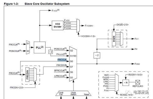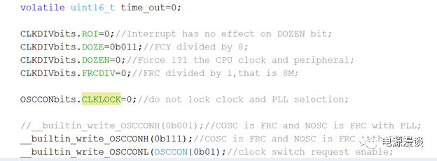再通过MCLKSEL的设置选择11,即APLL辅助锁相环的后分频输出,而我们将APLL的后分频输出事先设置为500MHz的频率(关于dsPIC33CK芯片的时钟PLL及APLL的设置,由于篇幅关系我们不在本篇文章中做说明)。
