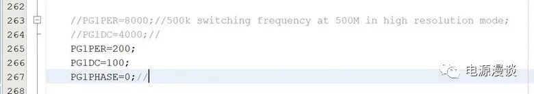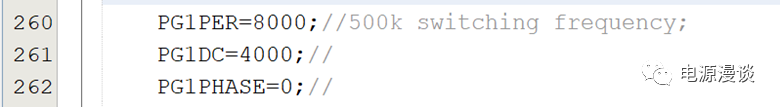在数字电源设计中,为了尽可能的利用处理器的最大字长,即16位的Q15整数对应+32767为最大字长,除了采用Q15格式表示线性差分方程系数之外,还需对它进行一系列的缩放操作(这一部分内容我们放在后面的话题中进行讨论)。如果采用Q15进行线性差分方程系数的定义,那么通过调用环路计算函数2P2Z或者3P3Z产生的结果(周期或者占空比)也将以Q15的范围进行限制,即最大限制为0x7FFF,即32767,如果考虑到电源设计中对最大占空比的限制,这个值将被设置的更小。所以在500M频率下使能PWM的高精度HREN=1的模式时,最大分辨率为250pS时,对应最大周期为8.191uS,即122kHz,如果最大周期高于8.191uS,或者开关频率低于122k,在闭环设计中就不能采用Q15格式进行计算,用户需要对环路补偿器的运算及线性差分方程系数定义做适当变化。