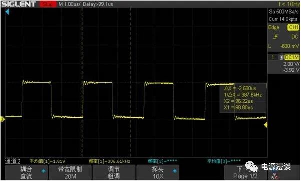 此时PWM开关频率为250kHz。对此频率进行分析,输入时钟频率500MHz,进行分频后输入给PWM模块PG1的输入频率为250MHz,假定PWM内部的PLL在工作的话,实际PWM的时钟频率为2GHz,则对应分辨率为500pS,根据周期PG1PER和占空比PG1DC的设置,其计算周期为4uS,对应实测的250kHz,以上说明PWM模块内部的8倍频PLL在启用PWM主时钟分频时在常温demo下还是正常工作。