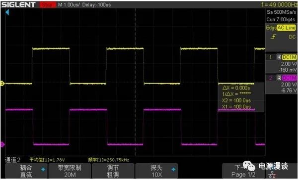 实测结果我们得到了如下波形,通道1为PG1H,通道2为PG1L,代码中我们设置二者为互补输出模式。
