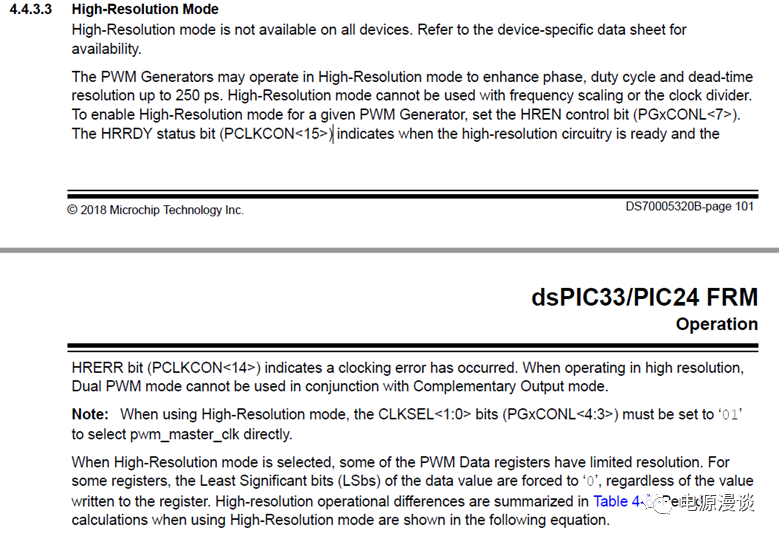 第一,我们总结一下产品规格书及PWM模块reference manual中dsPIC33CK系列PWM高精度模式的使用条件说明。