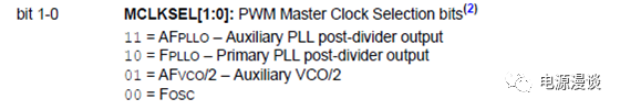 对应PWM模块(如PG1)的时钟源选择寄存器CLKSEL设置为01,意味着PG1的时钟源直接选择PWM主时钟源。