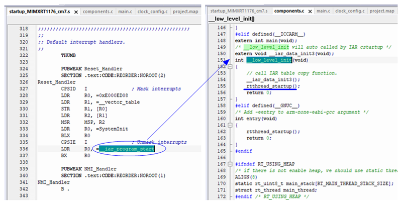 经过裸机工程、RT-Thread 工程、FreeRTOS 工程三者对比,痞子衡找到了问题所在。RT-Thread 内核启动是在 /src/components.c 文件中的 low_level_init() 函数里,而这个 low_level_init() 函数本应是 IAR 入口函数 iar_program_start() 中的一部分(IAR 系统库里有一个内置 PUBWEAK 版本),但是 RT-Thread 重实现了这个 low_level_init() 函数,很不幸的是 IAR 链接器对于自定义段的函数重定向认定与原内置 __low_level_init() 函数设计有某种内在关联。