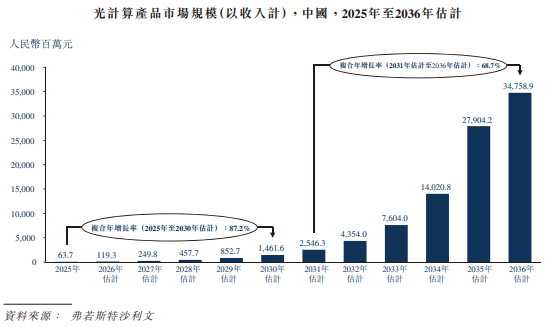 在AI算力需求持续爆发的当下,传统电计算及电互连受限于摩尔定律及物理极限,在成本、可扩展性、性能及能耗方面的瓶颈日益凸显,算力短缺问题愈发突出。而光电混合算力通过更高效的单芯片计算及光互连,直击算力短缺痛点,大幅降低客户计算成本,已成为算力基础设施演进的重要方向,有望推动计算性能实现重大跃升。根据弗若斯特沙利文的资料,中国scale-up光互连市场规模预计将从2025年的人民币57亿元增长至2030年的人民币1805亿元,复合年增长率高达99.6%;中国光计算产品市场规模预计从2025年的人民币63.7百万元增长至2030年的人民币1461.6百万元,复合年增长率达87.2%,长远来看,2031年至2036年期间,光计算产品市场规模将进一步扩张至人民币34758.9百万元,复合年增长率68.7%,赛道增长潜力巨大。曦智科技预计,大约在2035年之后,光计算与电计算产品及解决方案将实现大规模共存,行业将迎来全面爆发期。