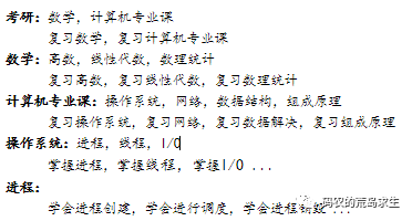 有时我们的目标可能不是简单的诸如每天跑五公里之类,比如像通过一门考试,学会一项技能这样的系统性工程。这时我们可能一下子不知道要做些什么,那么这就需要进行任务分解了,即这里的规则就是,把一个大的目标分解为一个个小的目标,如果对于其中一个小的目标还是不够具体,那么就继续将小目标进行分解,直到将每个小目标分解为如每天读懂两个章节,做完十个练习题之类很具体可以马上实施的任务为止。到这时,对于如何实现这个大的目标就很清晰了,只需要严格按照计划去实施就好了。比如对于考研,我们就可以列出如下的计划: