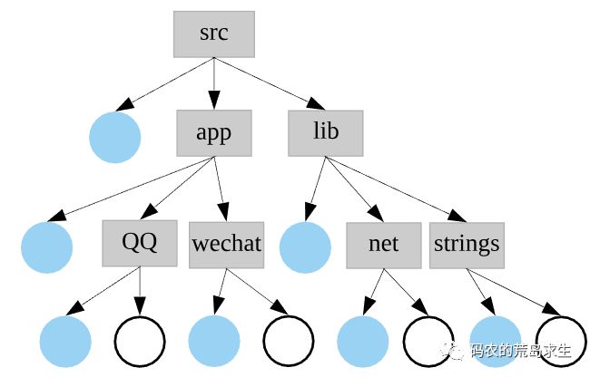 大型项目中通常会有成百上千甚至上万个源文件,这些源文件统一放在了一个文件夹中方便管理。典型的项目如图所示,圆形代表源文件,其它为文件夹。注意这里仅仅为说明问题,各个公司团队都有自己的代码组织以及命名方式,而且真实项目要比该图复杂的多,但是本质上这里的讨论适用于其它情况。