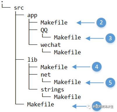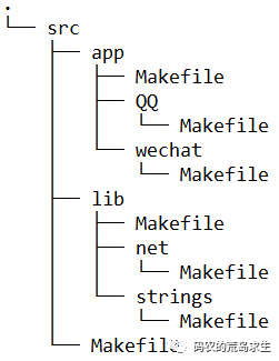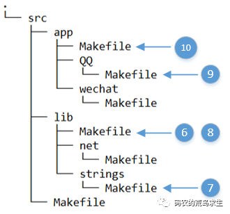 编译工具的这项功能,方便了项目的模块化管理。使得项目中每个模块都可以有独立的编译脚本,比如使用make进行编译的话,那么每个模块中都会有单独的Makefile,比如在文件夹net,strings中都有自己的Makefile。如上图中蓝色部分,其中白色部分为源文件,更清晰的关于Makefile的组织方式如下图所示: