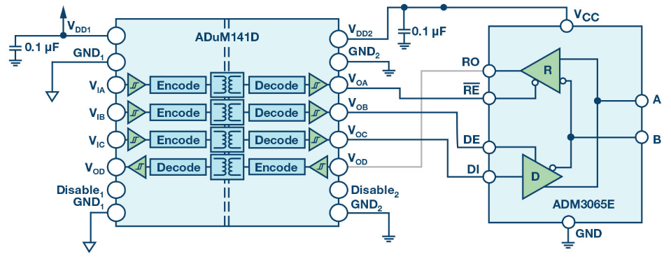 RS-485信号传输是平衡的差分式传输,本身便能抗干扰。系统噪声均等地耦合到RS-485双绞线电缆中的每条导线。一个信号的发射与另一个信号相反,耦合到RS-485总线的电磁场彼此抵消。这降低了系统的电磁干扰(EMI)。此外,ADM3065E增强的2.1 V驱动强度支持在通信中实现更高的信噪比(SNR)。给ADM3065E增加信号隔离可利用 ADuM141D轻松实现。ADuM141D是一款采用ADI公司 iCoupler® 技术的 四通道数字隔离器。ADuM141D的工作数据速率高可达150 Mbps,因此它适合与50 Mbps ADM3065E RS-485收发器一起工作(参见图2)。直接功率注入(DPI)法测量器件抑制注入到电源或输入引脚的噪声的能力。ADuM141D采用的隔离技术已通过测试,符合DPI IEC 62132-4标准。ADuM141D抗扰度性能超过同类产品。ADuM141D在整个频率范围内保持了出色的性能,而其他隔离产品在200 MHz至700 MHz频段出现位错误。