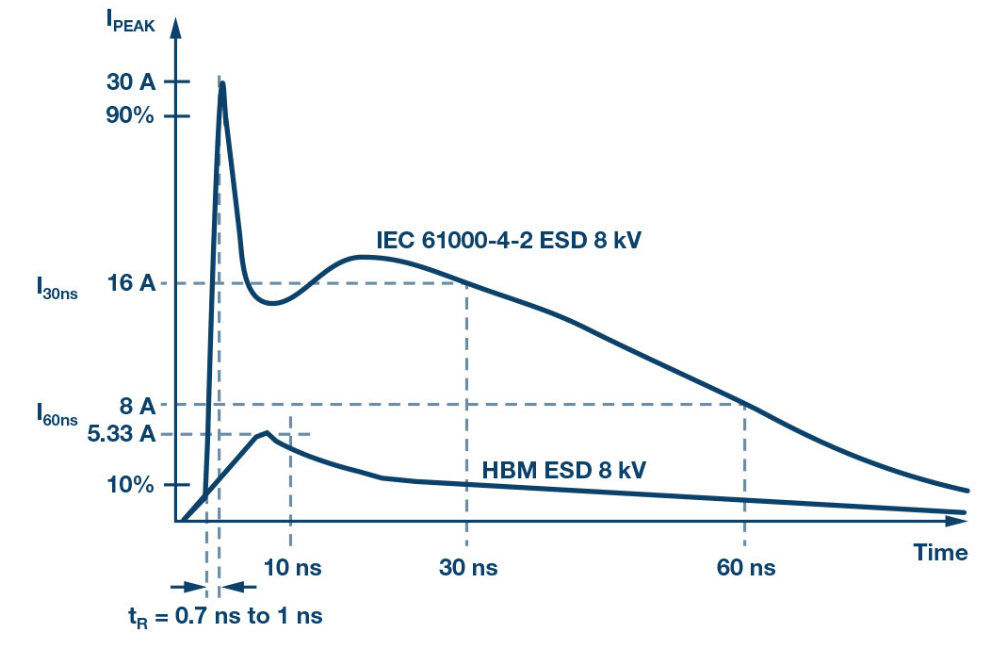 图3. IEC 61000-4-2 ESD波形(8 kV)与HBM ESD波形(8 kV)的对比