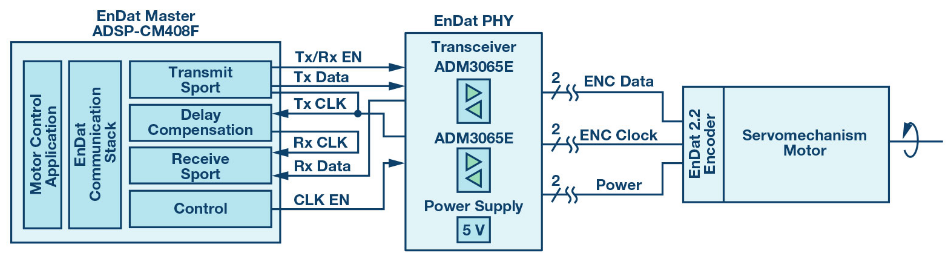 本文讨论的EnDat接口是在ADI公司的ADSP-CM40x上实现,后者是一款针对电机控制驱动器而开发的处理器。除了脉宽调制器(PWM)定时器、模数转换器(ADC)和sinc滤波器等用于电机控制的外设以外,ADSP-CM40x还有高度灵活的串行端口(SPORT)。