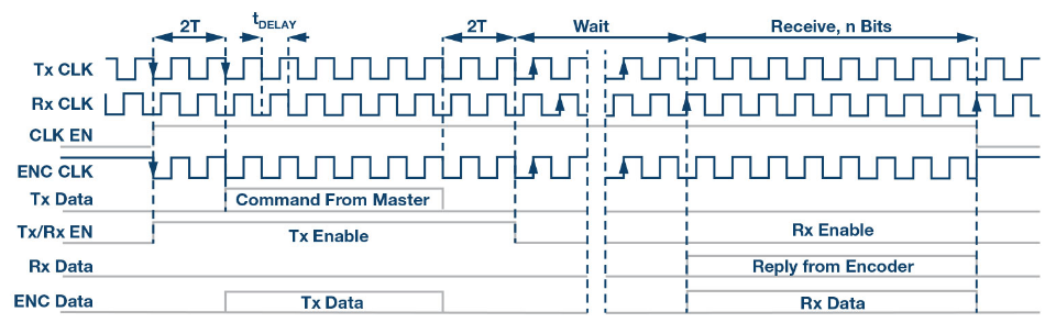 来自处理器的时钟信号是连续的,而EnDat协议规定,时钟只能在通信期间施加于编码器。在所有其他时候,时钟线路必须保持高电平。为此,处理器产生一个时钟使能信号CLK EN,其被送至ADM3065E数据使能引脚。恰好两个时钟周期(2T)之后,主机开始在Tx DATA上发出命令。