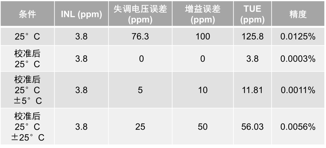 ADC 的精度会影响仪器输出的精度。测量精度取决于测量单元中误差的热漂移和工作温度范围。测量中的偏移和增益误差可在仪器加电后使用校准电路进行校准,以便提高精度。ADS9219 的 18 位分辨率可实现高精度测量,如表 3 中所示。