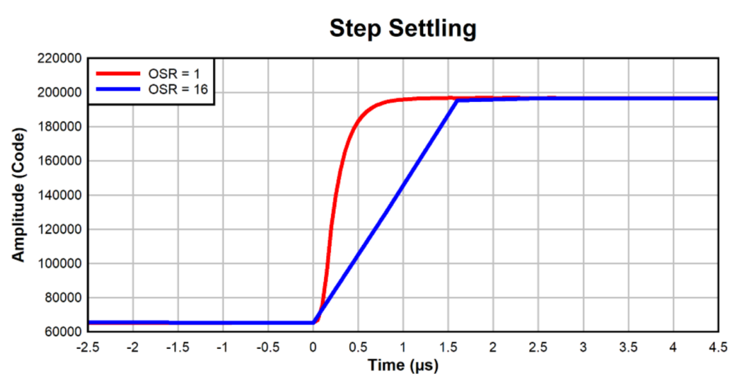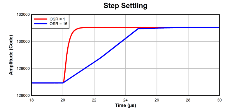 图 4. OSR = 1 和 OSR = 16 时的电流反馈电路阶跃稳定