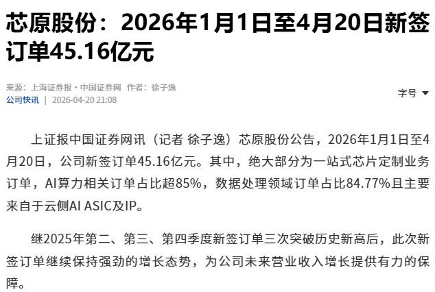 4月20日晚间,芯原股份披露最新订单情况,2026年1月1日至4月20日新签订单实现显著增长,而订单的爆发式增长的原因,核心源于公司在AI ASIC赛道的技术深耕与全面布局,其背后是公司在半导体IP、芯片定制等核心技术领域的长期积累与持续突破。