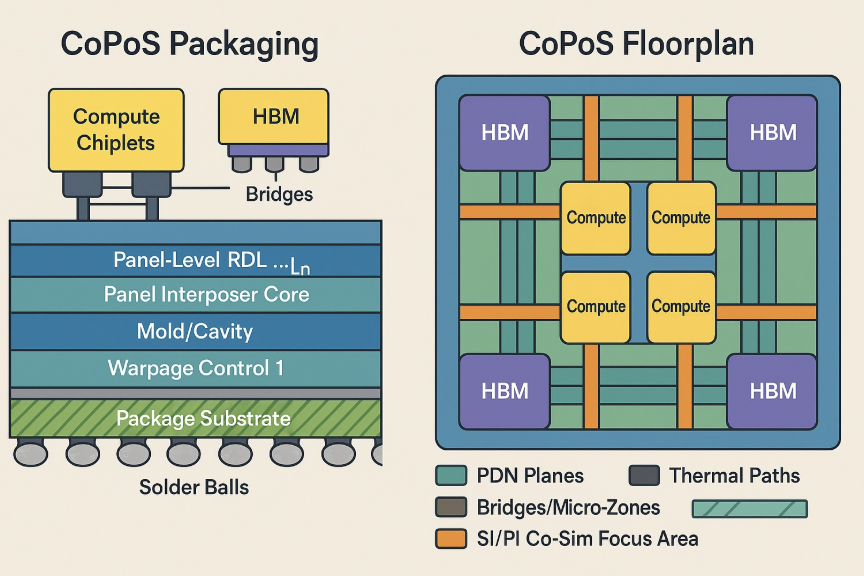 台积电(TSMC)正在研究的 CoPoS(Chip-on-Panel-on-Substrate) 是一种处于前沿开发阶段的先进封装技术,被视为目前主流 CoWoS 技术的延伸与进化方向。其核心创新在于将封装载体从传统的“圆形硅晶圆”更换为面积更大的“矩形面板”(通常基于玻璃或有机材料基板),通过这种 FOPLP(扇出型面板级封装) 模式,CoPoS 能够显著提升生产效率并降低单位成本。由于矩形面板在排布芯片时不会像圆形晶圆那样在边缘留下大量废料,且其物理尺寸上限远超传统晶圆,CoPoS 能够容纳更多数量的 GPU 计算核心与 HBM 内存组件,从而突破现有芯片尺寸限制(Reticle Limit),专门用于打造体积更庞大、算力更恐怖的下一代巨型 AI 加速器。