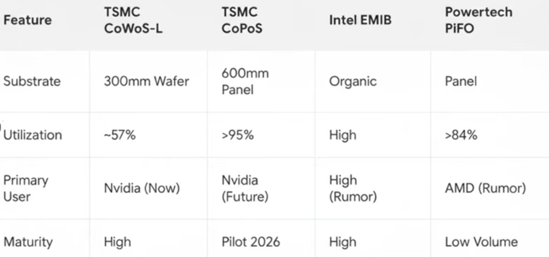 这张表格展示了一切。你看到 Nvidia 正在台积电安全地从成熟的 CoWoS-L 转向革命性的 CoPoS。与此同时,传闻 Google 正在探索 Intel 的 EMIB,而 AMD 正在关注一家名为力成(Power Tech)的公司。现在,这些都是可行的技术,但它们代表了巨大的战略赌博,是一次背离行业最稳定、最先进制造商的行动。