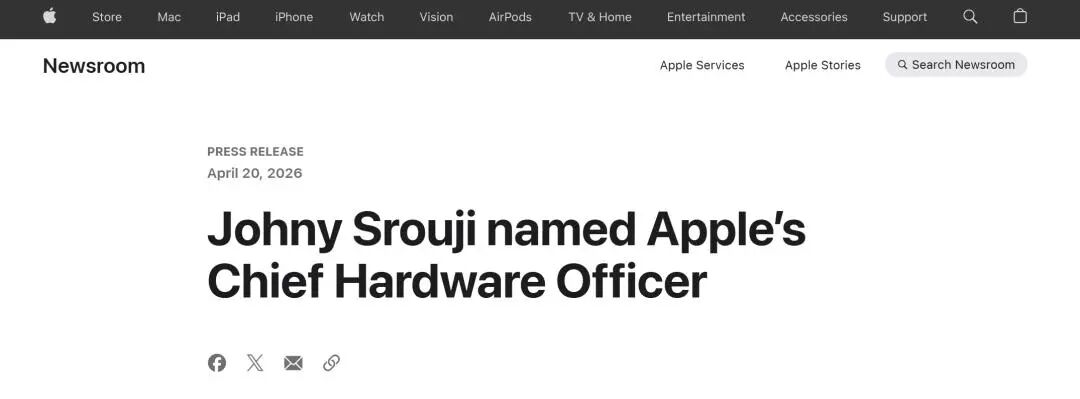 与CEO交接同步,苹果宣布约翰尼·斯鲁吉出任新设立的首席硬件官一职。斯鲁吉于2008年加入苹果,主导了A4芯片的研发,负责苹果全系列芯片、电池、摄像头等核心硬件技术。此次升职后,他将统管硬件技术与工程,原硬件工程负责人职位由Tom Marieb接任,向斯鲁吉汇报。