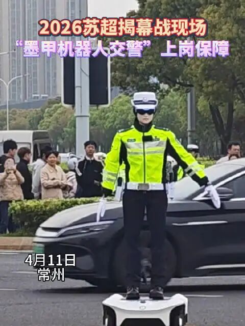 4月11日,2026江苏省城市足球联赛("苏超")揭幕战在常州奥体中心举行。由墨甲机器人联合常州市交警部门、常州星宇股份共同打造的交警机器人智警"常安"R050正式"授衔",身着"交通执勤制服"在赛场外围与交警协同执勤。据扬子晚报报道,该机器人能根据红绿灯变化做出直行、左转等指挥手势,还能与球迷互动,解答赛事相关问题。