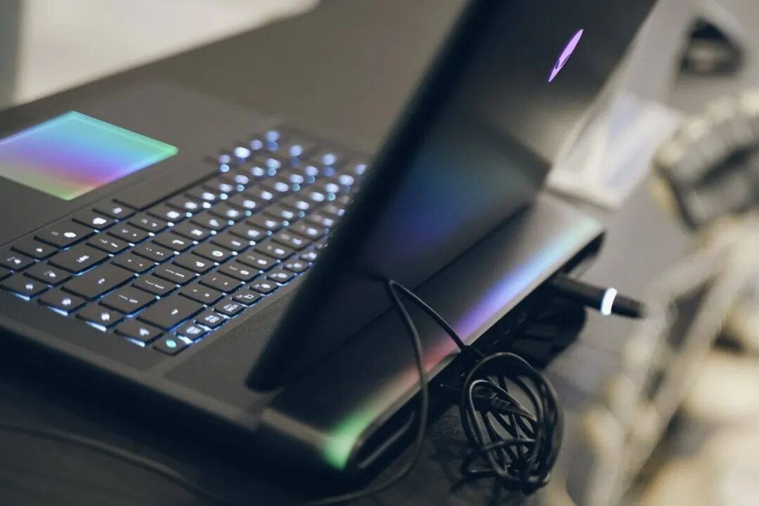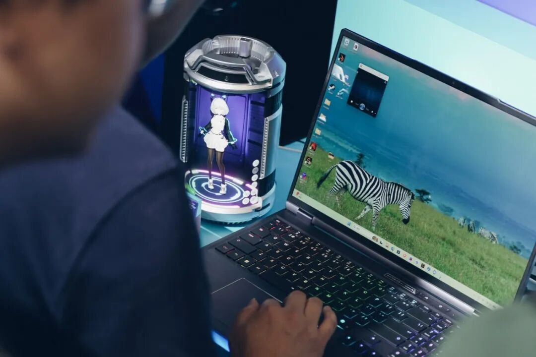 ▲ 笔记本左边的就是AI 3D角色舱,正面是个曲面屏,可在其中投射3D人物形象,并可做多模态交互;将其与笔记本相连,角色舱中的3D人物就能化身AI游戏助手,做各种相关当前游戏的实时交互…