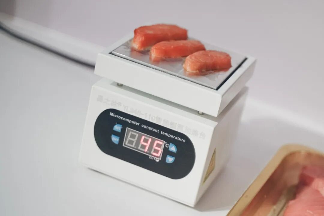 ▲ 为表现45℃和40℃的差异,演示区的45℃托盘在烤三文鱼…
