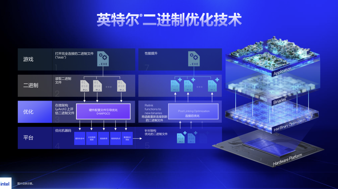 而IBOT更多是面向终端用户的,藉由Intel官方的IPPP软件包,用户可以一键手动开启游戏或应用的IBOT——即二进制优化。这个过程听起来很像是,IBOT通过监测成品应用的运行时负载,识别分支预测错误、cache miss、自旋锁、微架构热点等,来尝试创建“修正过的profile”,“针对指令做更优排序”“形成优化的、针对特定架构的二进制指令流”,最终提升IPC。