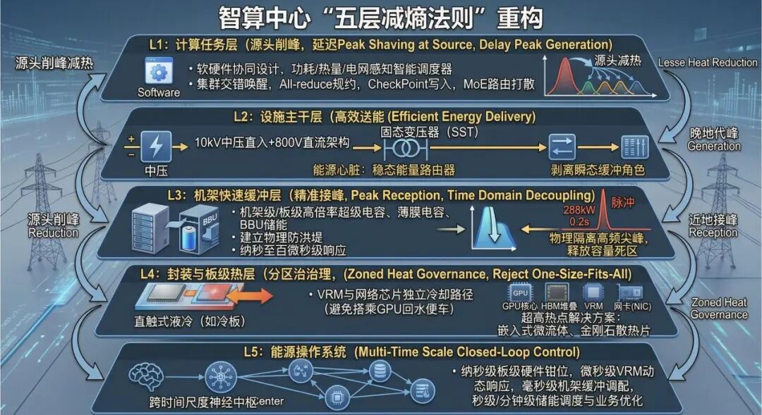 真正的终局,是建立一套贯穿 任务削峰、稳态送能、快速缓冲、热点治理、多尺度控制 的五层能源操作系统,让每一度电更少地变成废热,更高比例地变成可交付算力。