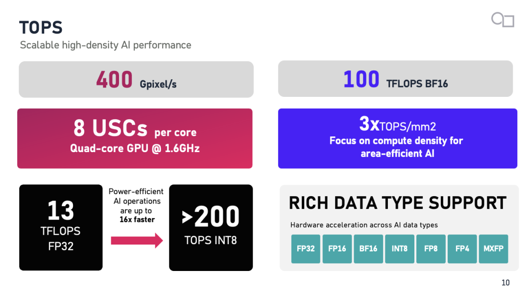 郑魁在演讲中说,E系列GPU“能够提供出色的性能伸缩(scaling),不管是tensor级别的,还是多核,乃至多chiplet的scaling”——这也是Imagination GPU IP一直以来的优势。如下图所示,在AI性能表现上,除了对诸多数据格式的广泛支持,“8个USC处理单元/核的4核GPU,能够提供200 TOPS INT8算力。”