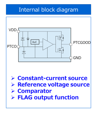 从Thermoflagger™ 的内部框图可以看出,它由恒流源、参考电压源、比较器和FLAG输出功能组成。Thermoflagger™ 向PTC热敏电阻提供小的恒定电流,以检测其电阻(温度)的变化。