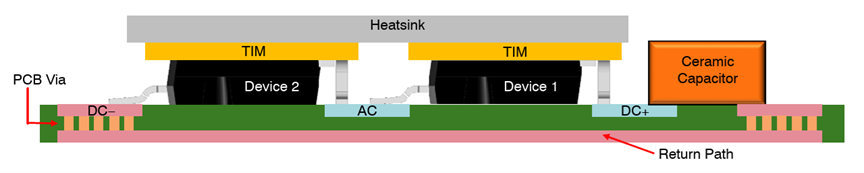 相比之下,底部散热封装依靠PCB的底部铜层进行散热,这限制了其在电气布线方面的应用。这种限制使得紧凑型换向环路的实现变得困难,通常会导致更长的走线路径和更高的寄生电感。由于底层必须用于散热(通常通过散热过孔和大面积铜箔),因此将回流路径紧贴功率环路布线变得不切实际。这会导致磁通抵消效率降低和环路电感升高,从而对开关性能产生负面影响。在这方面,顶部冷却封装(例如T2PAK)比底部冷却封装具有明显的优势。它们的散热设计允许更灵活的电气布线,从而实现更紧凑、更优化的换向环路。