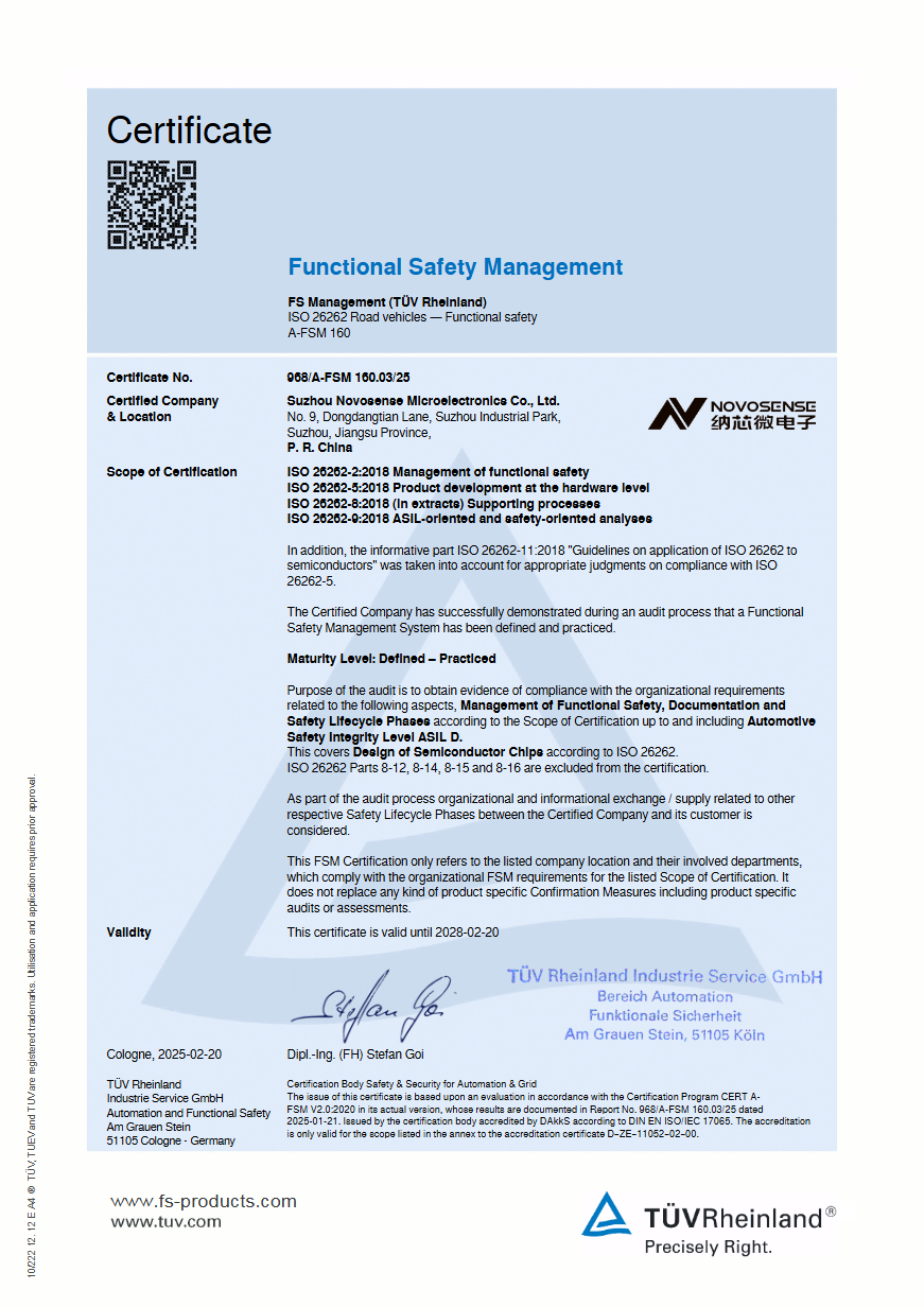 这套成熟的体系已成功赋能多款关键产品的全生命周期开发,实现从标准到落地、从流程到产品的可靠闭环。NSI6911F系列芯片获得权威机构TÜV莱茵ASIL D产品认证,正是这一体系实力的最佳例证。