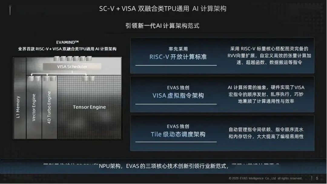 技术实力的持续突破是奕行智能获得资本青睐的核心原因。在核心技术层面,公司围绕自研EVAMIND计算架构,持续推进RISC-V、VISA虚拟指令技术、Tile级动态调度、编译器、运行时与系统互联的协同建设,强调通过软硬协同,将芯片、编译器、算子库、运行时和集群部署能力整合为一套可持续演进的平台体系,以适应大模型、MoE、长上下文、多Agent协作和复杂推理流程带来的负载变化。值得一提的是,其基于Tile级动态调度方向的研究成果——TISA动态调度架构,成功入选计算机体系结构国际顶级会议ISCA 2026,这一突破不仅填补了行业空白,更标志着中国AI芯片企业在核心技术路线设计上达到世界领先水平,该架构可使芯片根据实时运行状态自主决策任务分配,大幅提升算力利用率,在FlashAttention-3注意力机制测试中,代码量减少30%,同步调用次数降低50%,性能达到手工优化基线的95%以上。