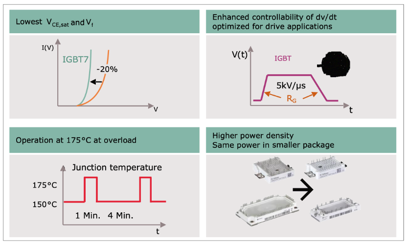 IGBT 7允许在过载条件下短时间内将结温提升至175°C,显著提升了输出功率能力,为系统设计提供更充足的可靠性和安全裕量。
