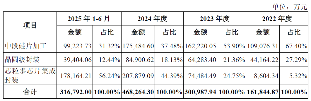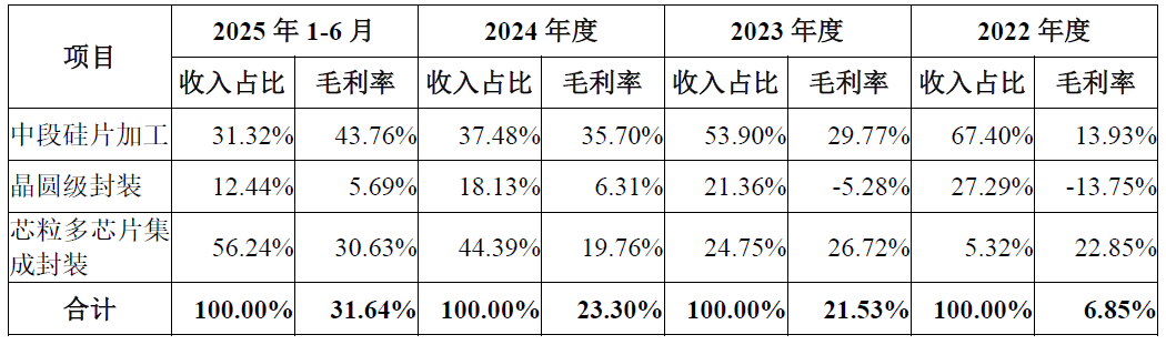 从收入结构看,芯粒多芯片集成封装已跃升为公司第一大主营业务。2025年上半年,该业务营收占比升至56.24%,中段硅片加工占比31.32%,晶圆级封装占比12.44%。公司主营业务综合毛利率从2022年的6.85%攀升至2025年上半年的31.64%。