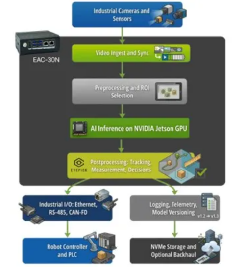 EverFocus EAC-30N负责硬件落地。这是一台基于NVIDIA Jetson Orin NX的无风扇工业边缘计算机,搭载6或8核Arm Cortex-A78AE处理器,内存8GB或16GB,支持RS-485、CAN FD、GbE等工业接口,9到36V宽压直流输入,工作温度覆盖零下20摄氏度到60摄氏度,可壁挂或DIN导轨安装。这些规格的意义在于:它能离开实验室,直接装进机柜,接上产线。