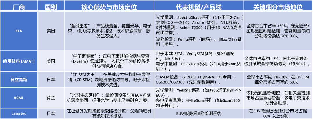 全球半导体前道缺陷检测与量测设备市场呈现 高度集中 的寡头垄断格局。整体而言,前十大厂商合计占据约 93% 的市场份额,其中 KLA(科磊) 是公认的行业霸主,与应用材料(AMAT)、日立高新(Hitachi High-Tech)、ASML及Lasertec等构成了“一超多强”的竞争态势。